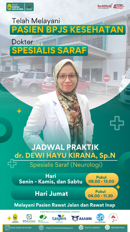 Selengkapnya RSUD Saras Adyatma telah melayani pasien BPJS Kesehatan untuk Poli Saraf (Neurologi) Kabar Baik untuk Sahabat Sehat!RSUD Saras Adyatma kini telah melayani pasien BPJS Kesehatan ...