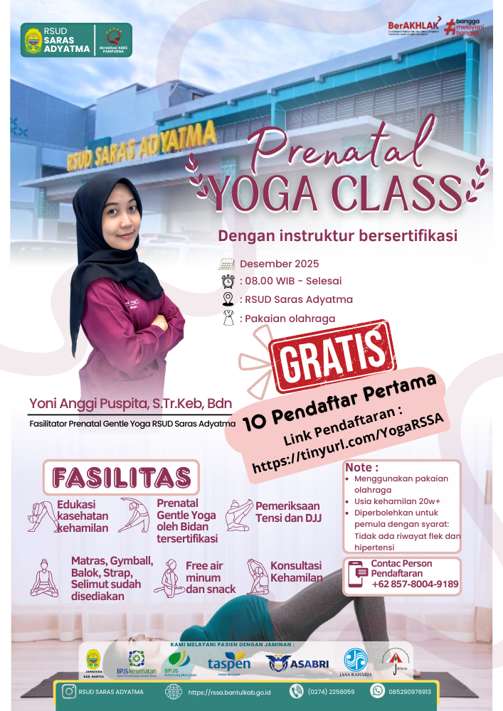 Selengkapnya Prenatal Yoga Class di RSUD Saras Adyatma Wujudkan kehamilan yang lebih sehat, rileks, dan nyaman bersama kami 💗RSUD Saras Adyatma ...