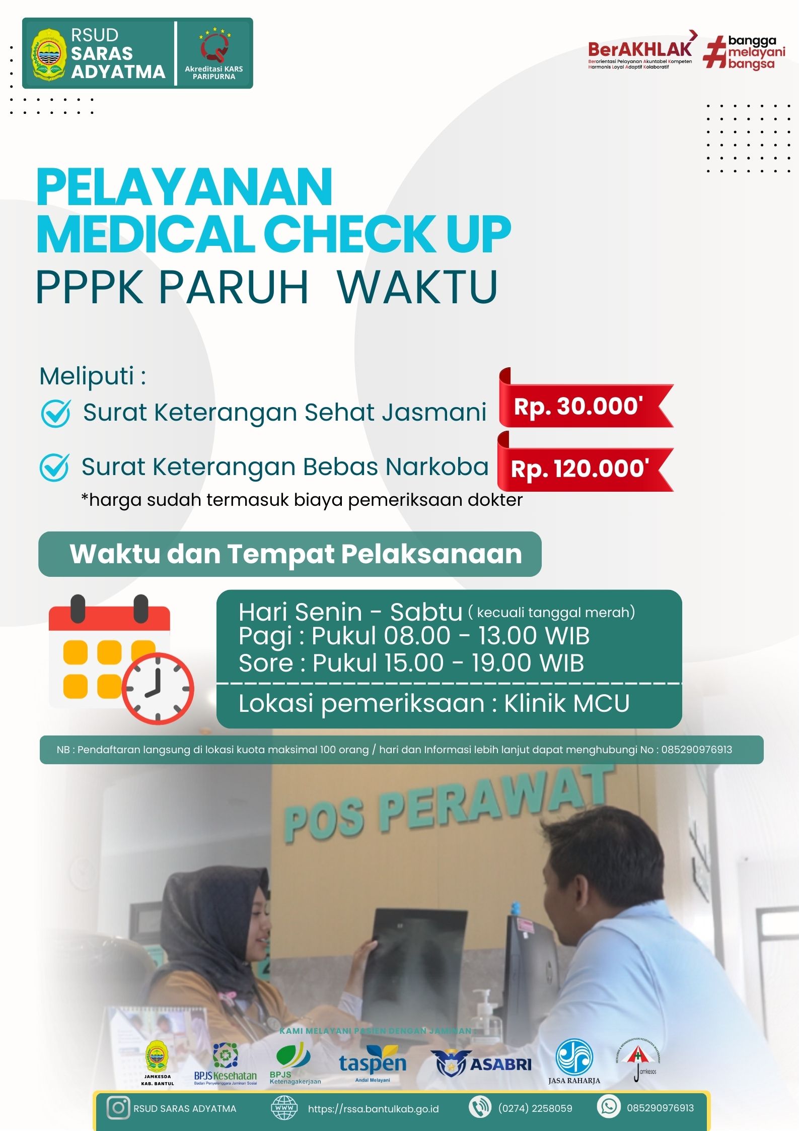 RSUD Saras Adyatma melayani Medical Check Up PPPK Paruh Waktu.🔹 Surat Keterangan Sehat Jasmani 30.000🔹 Surat Keterangan Bebas Narkoba 120.000💰 Harga terjangkau sudah termasuk biaya...