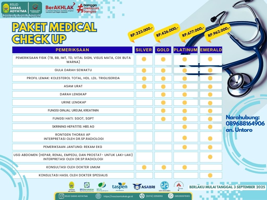 Jaga kesehatan adalah investasi terbaik untuk masa depan!Berlaku mulai 3 September 2025.RSUD Saras Adyatma menghadirkan berbagai paket Medical Check Up lengkap dan terpercaya sesuai kebutuhan...